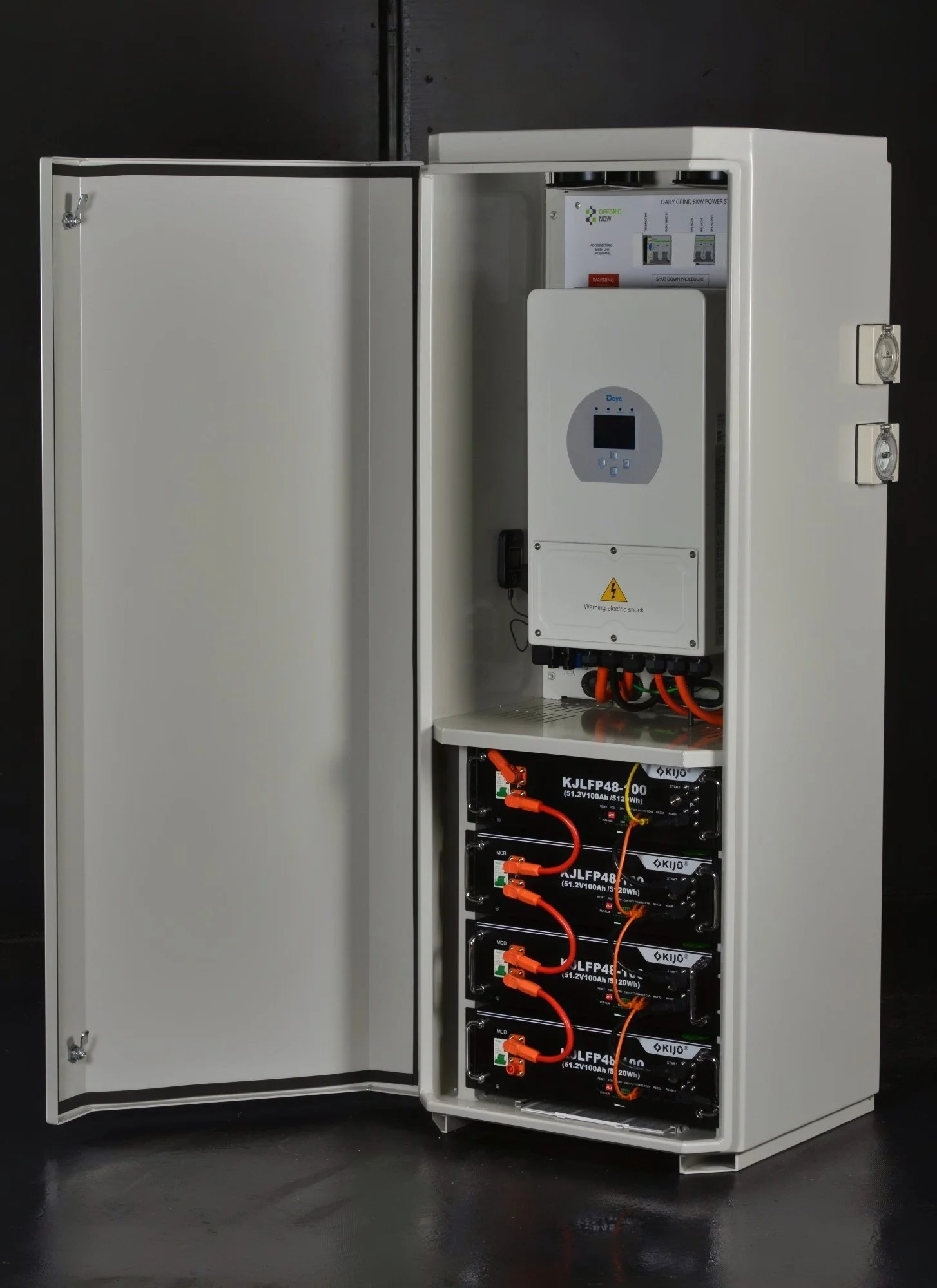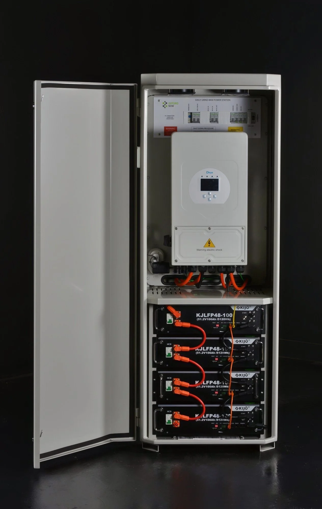 The OFFGRID NOW® DAILY GRIND 8 power cabinet is fitted with the powerful 8kW DEYE hybrid inverter range, and is VPP-Capable. Our SAA accredited off-grid solar installers ensure that the inverters in our OFFGRID NOW® power cabinets are safely integrated into your dwelling and comply with Australian Standards and Regulations. VPP-capable inverters enable you to sell your excess energy back to an energy retailer, or if you want to be off-grid but live within a 1km of a grid-connection you can qualify for the rebate without needing to supply written evidence of the cost of a grid-connection from a Distribution Network Service Provider.