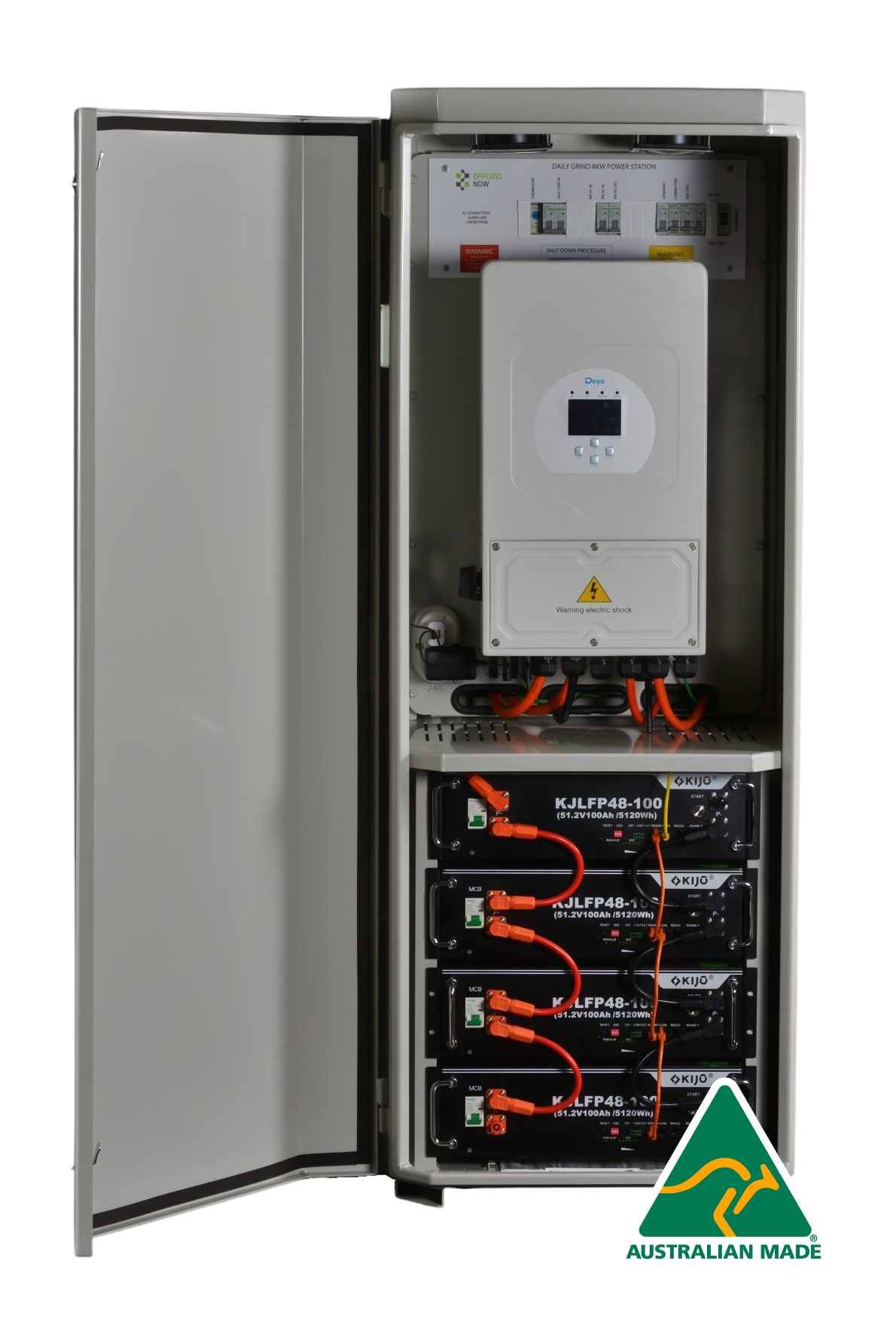 OFFGRID NOW® DAILY GRIND 8 power cabinets are Australian made to our design and specification in Brisbane, QLD. Our cabinets are manufactured to the highest standards of quality, utilising powder coated, 3mm aluminium, and assembled in our facility at Coolum Beach on the Sunshine Coast, QLD. Our cabinets are designed from the ground up to be rust-free and come backed with a 10 year warranty. With easy to access, front mounted lockable swing doors, you can sleep easy knowing your inverter and battery are stored safe and secure inside - for the long term.