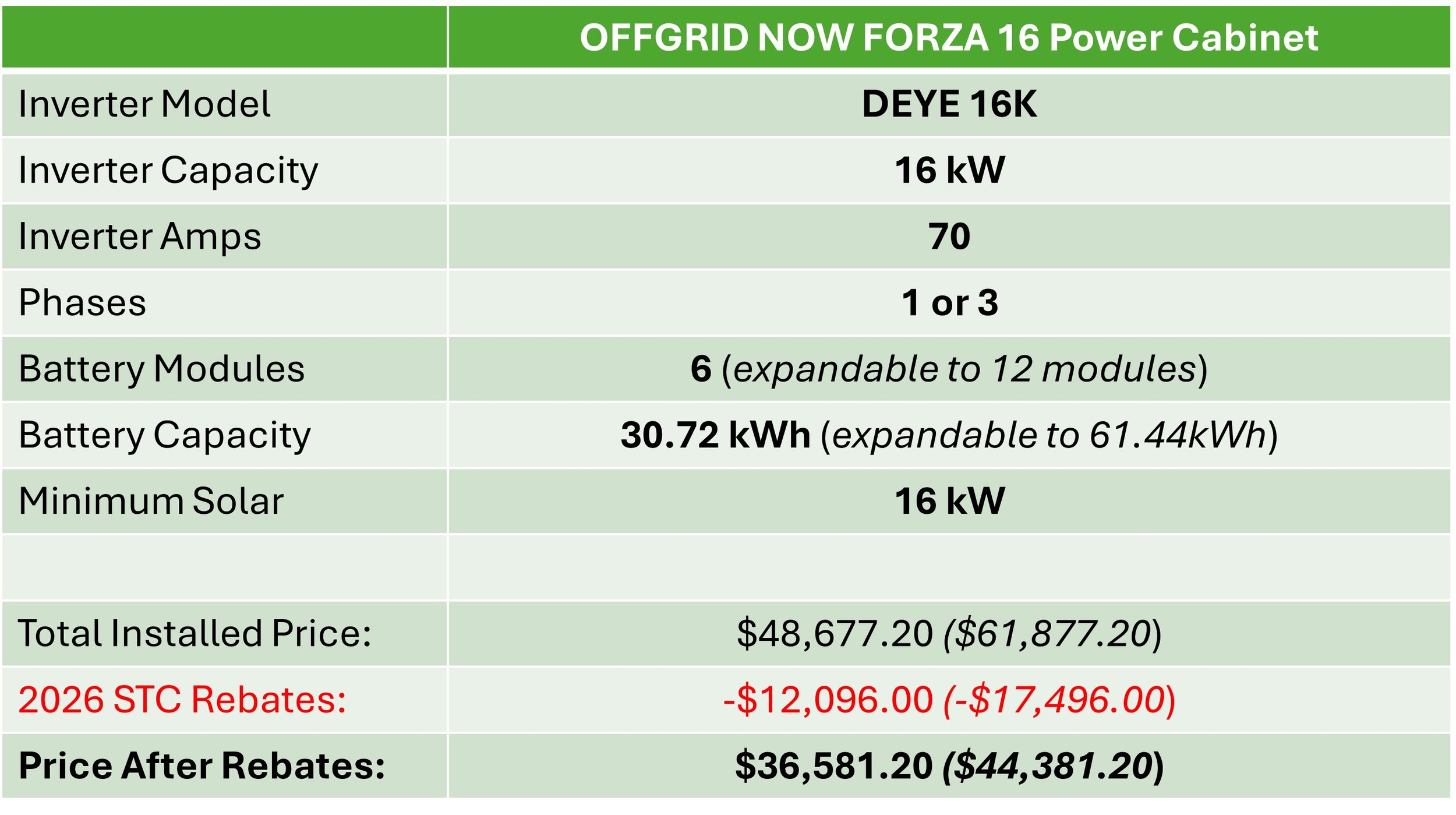 The OFFGRID NOW® Forza 16 power system can provide standalone power to large-sized homes from *$35,581.20.