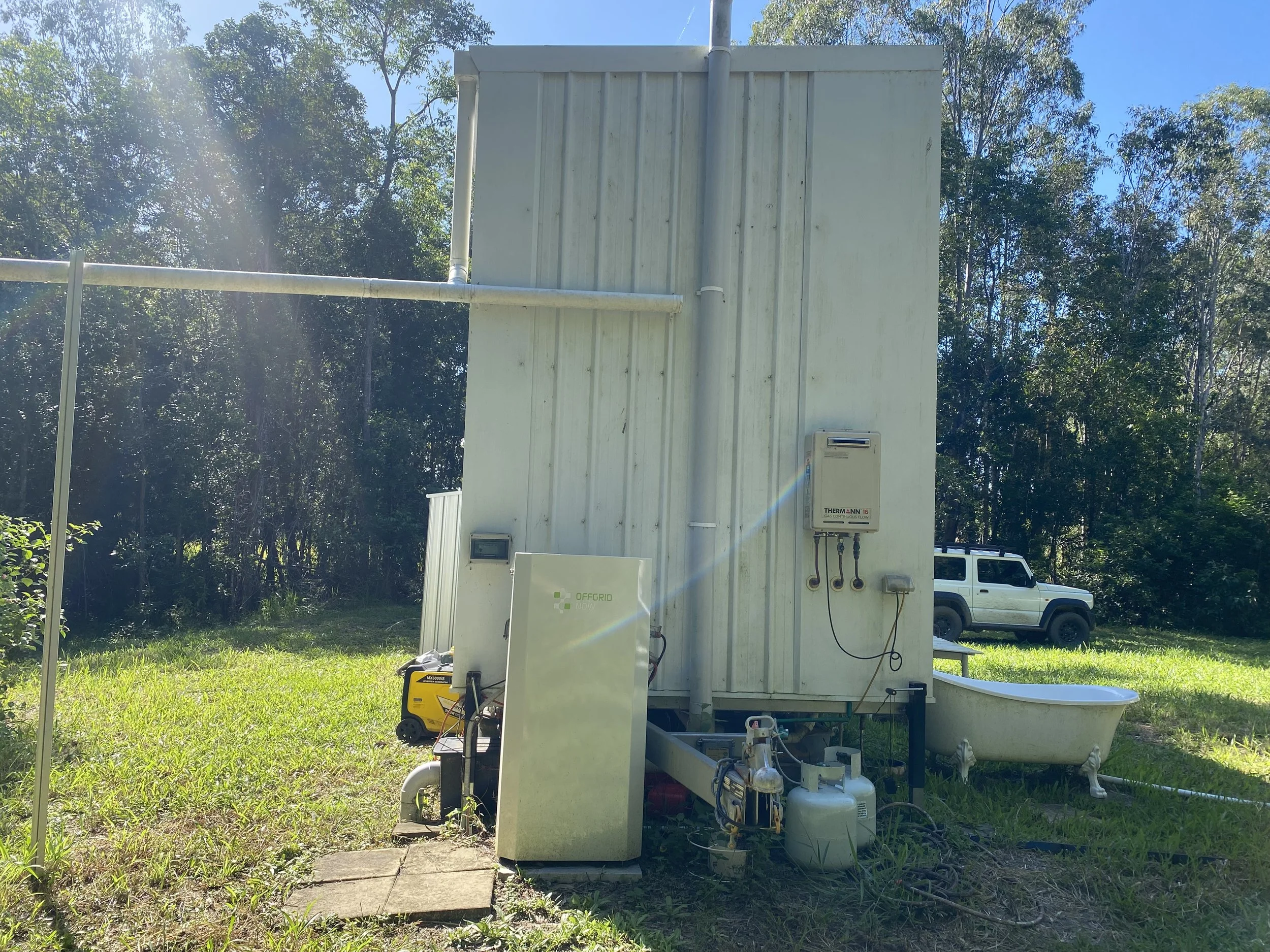 Nixie’s place is a quiet, tucked‑away spot in Doonan on the Sunshine Coast, QLD. A long dirt driveway through trees opens up to a tiny home that looks out over a large lake and grassy fields. Nixie has called this private patch of someone else’s property home for nearly three years. She’s completely off‑grid, raising her son and caring for a dog and two cats. Perched at the edge of her little place is the heart of her setup: an OFFGRID NOW® EXCELSO 5.10 power cabinet with a DEYE 5kW inverter and roughly 10.24kWh of storage, paired with a ground‑mounted solar array and a 6kW generator for backup.